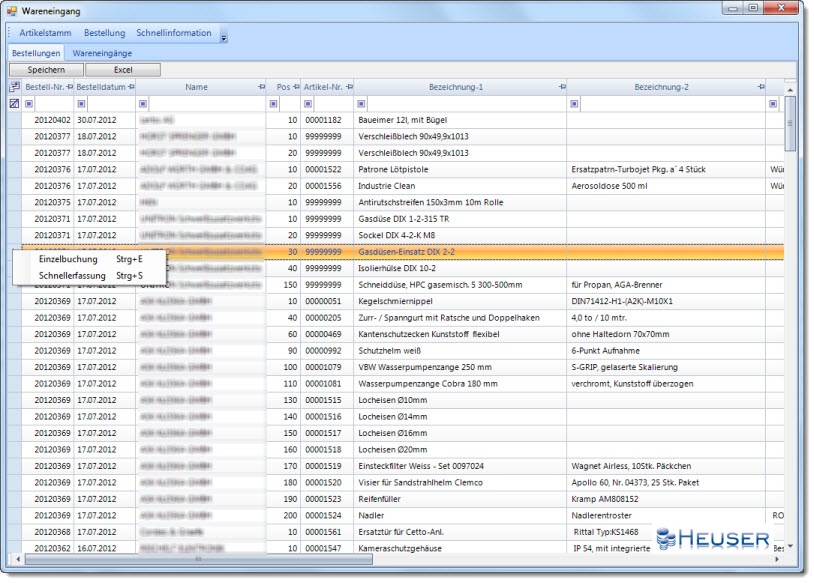 Um einen neuen Wareneingang erfassen zu können, markieren Sie eine Bestellnummer und klicken auf die rechte Maustaste. Anschließend klicken Sie auf Einzelerfassung oder Schnellerfassung.