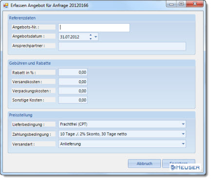 Prüft und speichert Ihre Eingaben. Die Anfrage erhält den Status Angeboten |