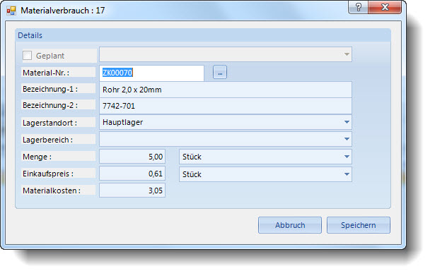In diesem Fenster können Sie geplante und ungeplante Materialverbräuche erfassen.