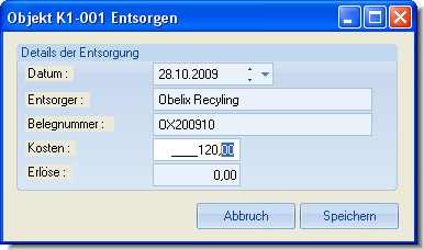 Dann öffnet sich das folgende Fenster, in dem Sie die Entsorgungsdaten erfassen und speichern können.