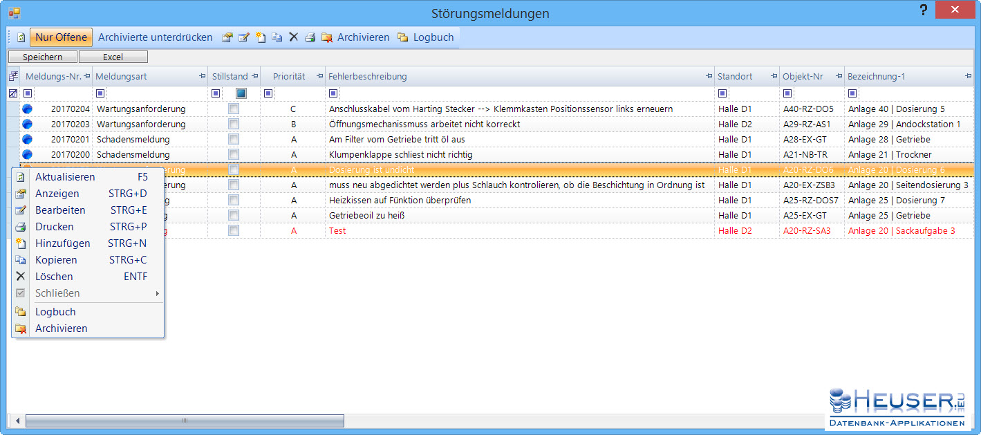Daraufhin ändert die Software den Bearbeitungsstatus, archiviert die Störungsmeldung und vermerkt den Status im Logbuch.