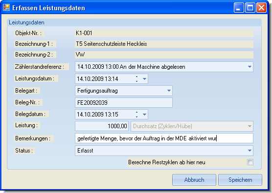 Mit diesem Programm können Sie erbrachte Leistungen (z. B. produzierte Mengen) oder zukünftige Leistungen (z. B. Prognosen) für ein Objekt erfassen, um dessen Zählerstand zum Leistungsdatum zu erhöhen und einen Verursacher in der Leistungshistorie einzutragen.