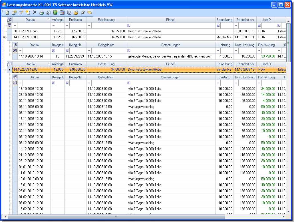 Leistungshistorie mit einer detaillierten Übersicht aller belastenden Belege (z.B. Fertigungsaufträge)