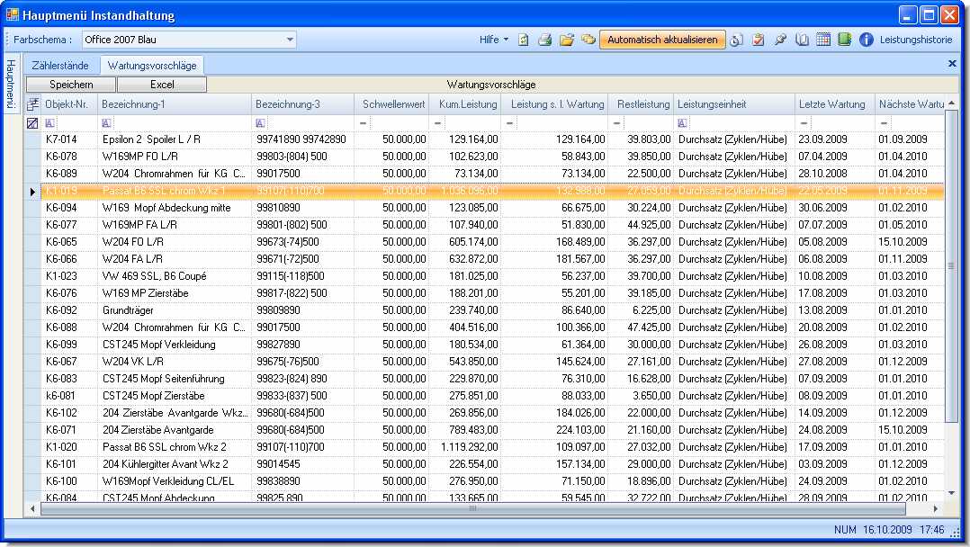 Dieses Programm zeigt in tabellarischer Form alle Objekte mit Wartungsvorschlägen an und erlaubt den Zugriff auf objektbezogene Informationen sowie die Freigabe von internen und externen Wartungsaufträgen.