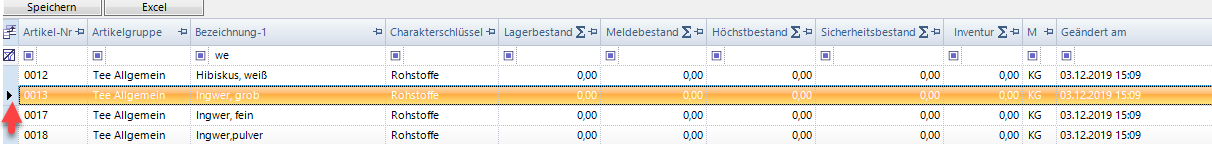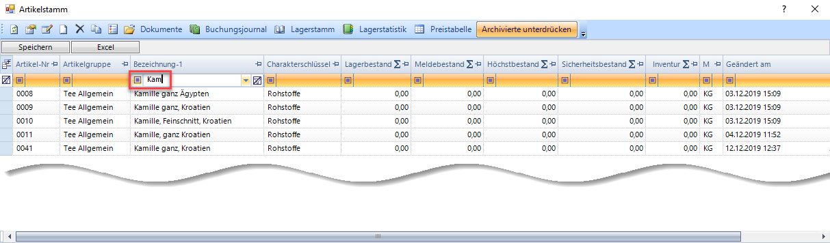 Im folgenden Beispiel wurde in der Spalte Bezeichnung der Suchbegriff Kam eingegeben, was zur sofortigen Reduzierung der Anzeige führt.