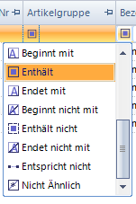 Den Filtertyp (z.B. Beginnt oder Endet mit) bestimmen Sie durch Anklicken des linken Symbols in der jeweiligen Spalte.