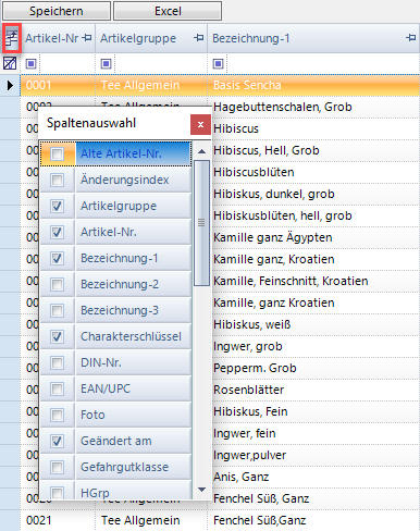 | Speichern | Mit dieser Schaltfläche speichern Sie nicht den Inhalt der Tabelle, sondern das Layout der Tabelle. Mit Hilfe der Spaltenauswahl können Sie angebotene Spalten unterdrücken. Wenn Sie die geänderte Spaltenreihenfolge, Spaltenbreite und Spaltenauswahl beim nächsten Programmstart wieder verwenden möchten, klicken Sie auf diese Schaltfläche. |
